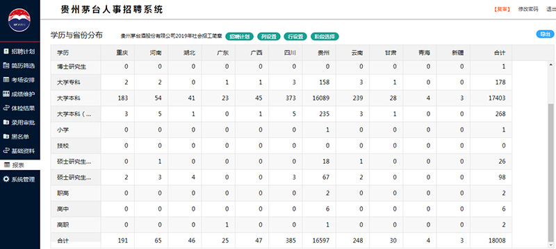 求職考生成績導入系統后,后臺推送到茅臺官網進行公示。同時,在線通知考試合格人員參加體能測試(男1000米,女800米,4分30秒內完成)。體能測試完成后,再按錄用數量110%的比例在線通知求職者到茅臺職工醫院體檢,系統自動打印求職者體檢表。對體檢合格擬錄用者,后臺仍然推送到茅臺官網進行公示。新的人才招聘系統,在支撐茅臺大批量人員招聘活動的同時,還與人事管理系統信息共享,實現新員工入職自動建檔。人事科負責人趙航談到新的人才招聘系統時表示,“新系統增強了我們在大型人才招聘活動的運作能力,讓我們節省了很多工作量和時間,更重要的是把很多業務環節納入系統,進一步實現了規范化管理。”