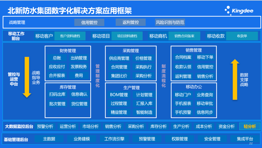 打造集團統一的業財一體化管理平臺,賦能北新防水集團,落實集團“一體化管理+區域化運營”, 以“質量、技術、標準,生產、采購、營銷,財務、人事、商務”九統一為原則實施一體化管理戰略,實現運營轉型。