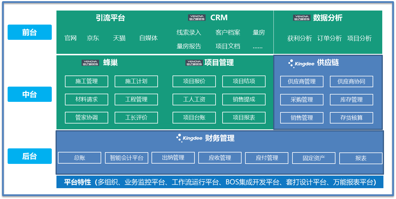 業之峰的整體信息化強調松耦合。業之峰是多組織企業,傾向通過系統的彈性化結構來適應來適應業務的變化和發展。金蝶云·星空以財務供應鏈為主數據平臺,連接引流平臺(獲客)、服務系統(CRM)、施工系統(峰巢)交付管理系統、大數據應用平臺,將相關業務整合在同一個系統平臺,打通需求、設計、供、銷、服、財、一體化價值鏈。也可滿足其“任一系統單獨拆出來都可以獨立運行,任兩三個系統結合起來都是可以對接”的需求。