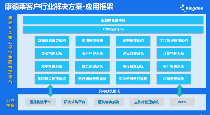 康德萊由于所處行業與其發展階段,其本次數字化轉型圍繞著集團管控、合規質控、持續降本幾個重點進行展開,其方案設計理念是:在業務、業財一體化平臺的基礎之上,著重建設GSP\GMP\UDI行業特性、標準成本,對外貿易等信息化應用。