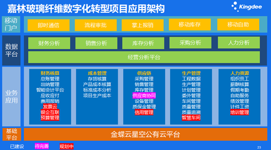 嘉林玻璃纖維數字化轉型總體目標為:打破業務與財務之間的信息壁壘,重建了一體化信息架構、實現流程互通、數據共享,使業務信息流準確、快速傳遞,提升業務效率。打通人力資源管理與財務管理的通道,實現數據互通,流程互聯。豐富功能應用,滿足財務、生產、采購、庫存、人力、協同辦公、數據分析等多樣化的需求,尤其是項目績效、項目成本核算、質保金等企業個性化需求,靈活擴展、成本可控。實現專門面向總經理的經營分析看板,實時反應業務財務數據指標,取代了手工繪制上報報表,效率更高、數據更準確。項目的數字化整體規劃圖如下:
