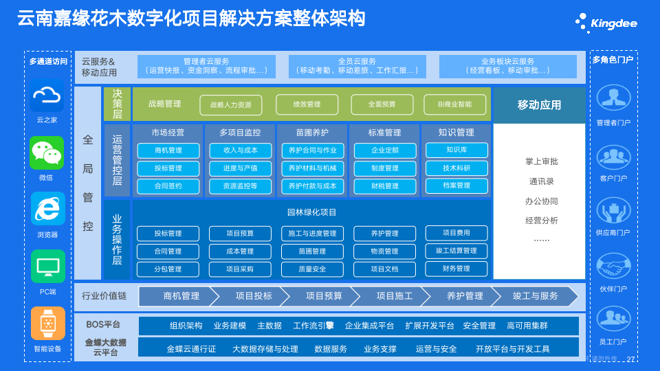 2018年,嘉緣花木為了把項目管理體系更好的落地,經過充分的考察,正式與金蝶達成戰略合作,共同打造具有園林行業特色的企業數字化大平臺,讓企業內部價值鏈采購管理、倉儲管理、工程項目管理、人力資源管理、行政管理、財務管理實現綜合的一體化。