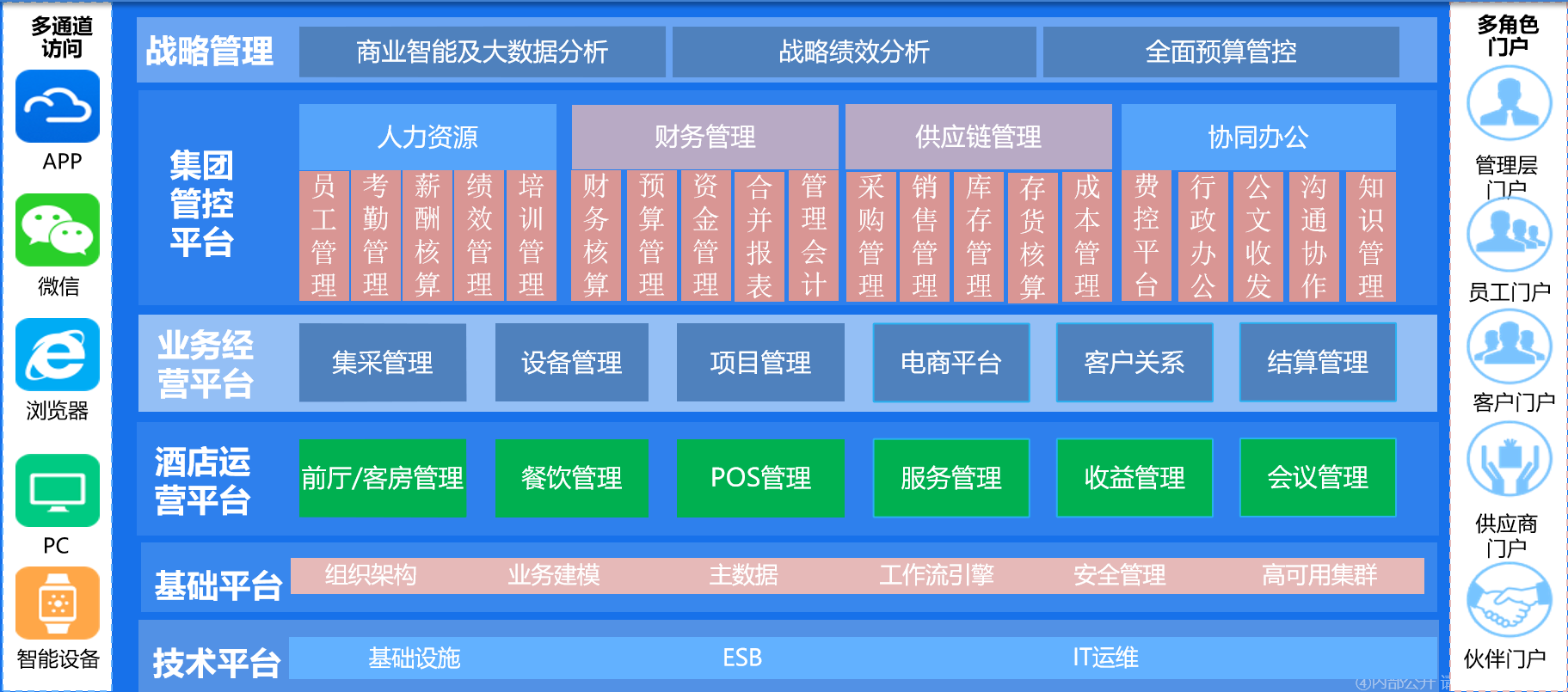 金陵飯店結合自身的發展特點,采取了標準化+個性化的方法,進行全面的基礎資料規范化和流程的優化,夯實金陵飯店管控的基礎。在夯實基礎的成果下,金陵飯店各個業務線齊頭并進,搭建了分層分級的人力資源管理體系、財務管理體系、供應鏈體系和協同辦公體體系,進行各個業務領域的全過程建設,提升專業水平,實現多元化下多種集團管控模式的隨需應變。