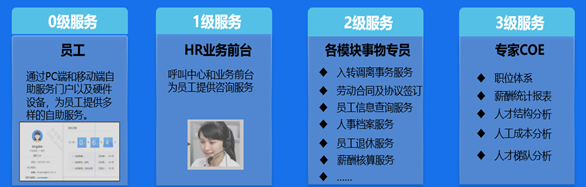 通過本期項目實施,搭建了共享的四級服務模式,業務流程統一梳理后納入共享。業務的標準化、集中化辦理,以及服務的分級提供,都進一步降低了人力資源的運營成本,提高服務水平。PC端、移動端以及智能硬件的對接和呼叫中心的接入,為員工提供了更多的服務渠道,共10+種自助服務。