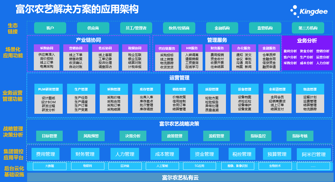 金蝶云星空+云之家移動辦公系統為富爾農藝提供了穩定的業務中、后臺,針對行業特性進行二次開發了農資收購系統、檢斤系統等行業特性模塊,使得富爾農藝公司在實際業務運營中從農戶收購—倉儲回運—生產加工—質量追溯—全渠道營銷—終端物流的高效協同,通過云之家移動辦公實時業務處理與監管,實現內部集中管控向外部業務協同的數字化轉型升級。