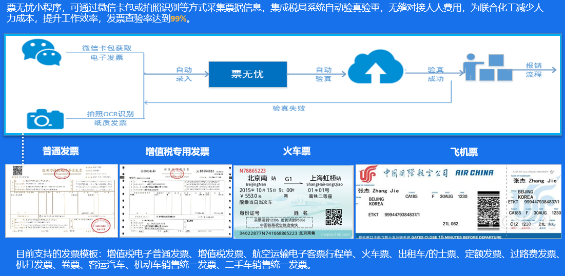 通過發票云控制源頭兩大風險點:一是重復報銷的風險,電子發票的打印次數不受限,也不需要額外加蓋專用章,這會帶來重復報銷的風險。二是虛假發票的風險,PS技術可輕易修改電子發票金額或抬頭,因此需要對電子發票進行真偽查驗。支持多種方式發票采集,發票查驗率達到99%。