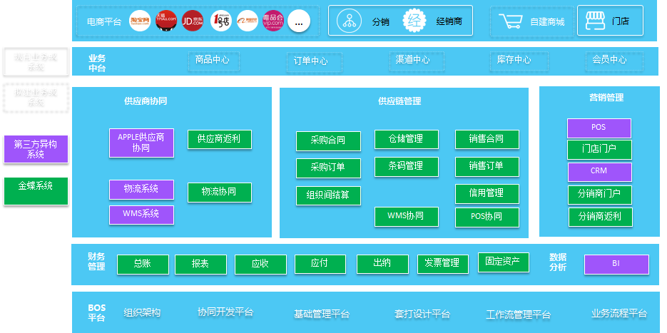 根據批發與零售行業特性,結合美承集團業務,打通多個異構業務系統,為美承集團構建集團化統一信息管理平臺,在系統中實現集中采購各業務場景、線上線下協同銷售、庫存統一規劃及調撥等業務場景,實現組織間集中結算、客戶供應商統一結算、財務成本精確計算的財務目標,全面實現業財一體、集團業務統一、庫存統一計劃與調配的管理目標。