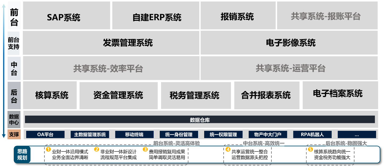 業務系統集成資金稅務檔案等系統,實現業財資稅檔一體化;共享平臺兜底線下手工業務(如房租水電、股權分紅等),實現流程線上化和規范化;核算系統統一為4套,實現核算標準化;共享運營平臺鏈接業務數據、資金數據、稅務數據、財務數據、主數據,打破數據孤島,實現全數據整合和分析,將為戰略分析起到數據支撐作用。