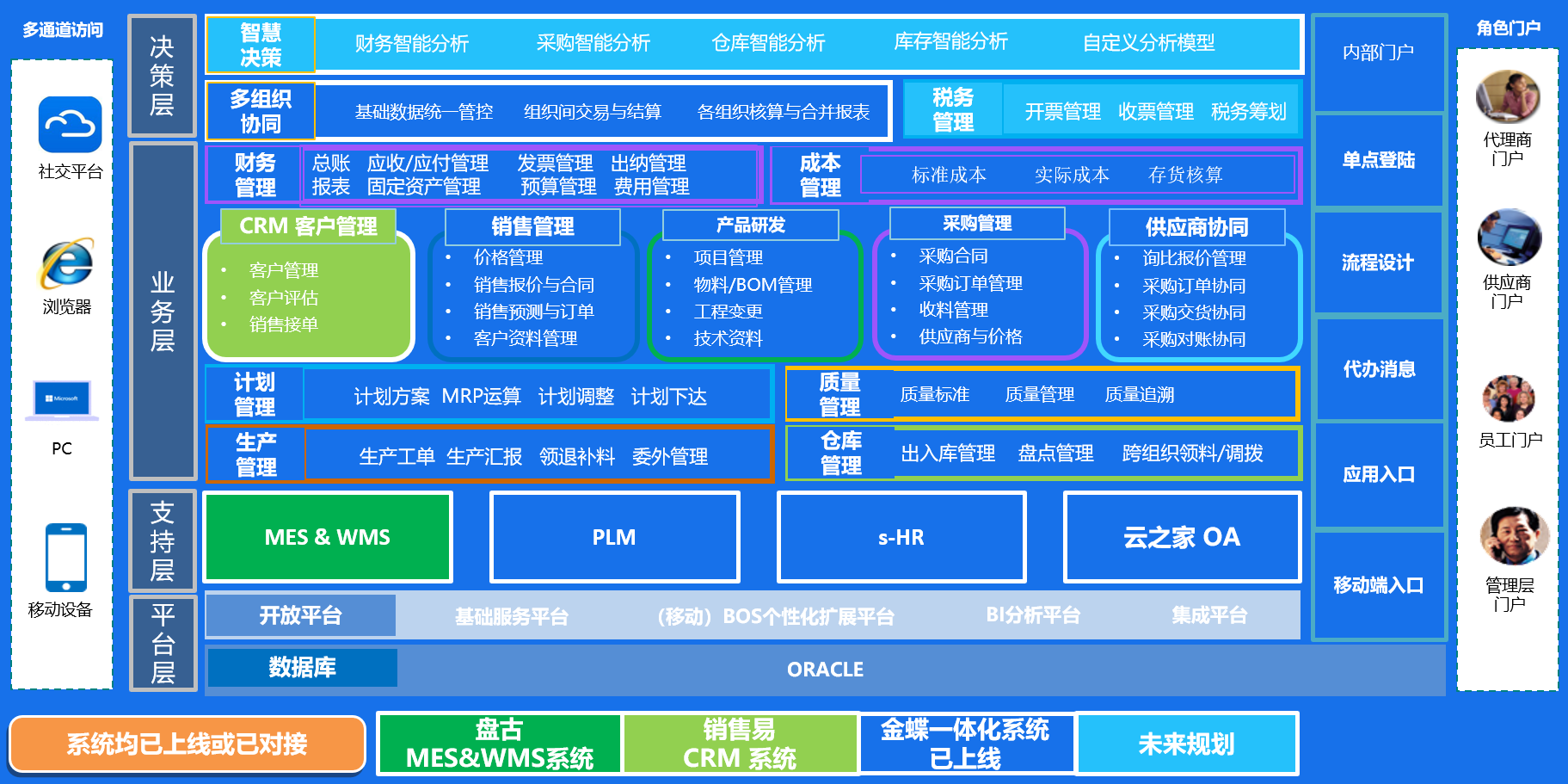 ERP、PLM、SRM、CRM、MES等多個系統集成,實現了研發、采購、生產、銷售業務的一體化協同,使得清越科技運營數字化轉型初見成效。通過云之家統一辦公門戶平臺,為內部人員、供應商、客戶提供隨時隨地的在線溝通與服務平臺,溝通無界,暢所欲言;鏈接員工、鏈接客戶、鏈接供應商,數據驅動引領企業業務轉型,為企業打造全新移動辦公體驗。