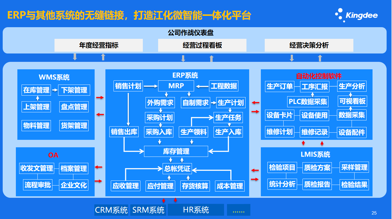通過金蝶云·星空ERP與OA、LIMS、WMS、HR等系統集成,搭建江化微智能經營析分平臺。實現數據交互,移動審批,業務數據入口唯一,避免在ERP與其他系統中重復錄入數據,工作效率提升;ERP的業務數據傳遞到OA,江化微副總張改仙提到,“集成后,公司領導層可以更方便實時參與到實際經營業務中的審批與監控;管理層可通過門戶實時得到所關注企業經營數據報表,實時掌控業務數據,管理和指導企業運營”。