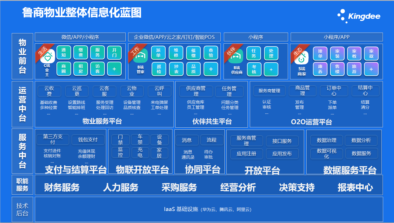魯商服務希望能夠搭建一個整體的信息化運營平臺,對內加強集團管控能力,通過技術手段落實管控策略,同時信息化工具,提升信息流轉效率,提高員工工作效率。對外搭建客戶服務平臺,讓客戶可以快速找到物業人員,物業人員也可以快速響應客戶訴求。同時,客戶通過物業服務平臺,可以享受安全科技化的生活,物業增值經營,也可以通過此平臺落地線上線下O2O模式,增加物業服務收入。