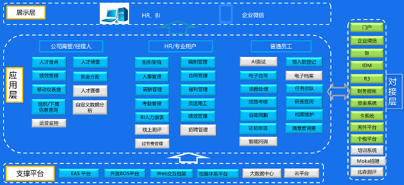 基于對人力資源管理新模式的轉型訴求,天虹數科以提升組織運作效率,改善人力資源業務運營,更好服務員工及公司決策為目標,構建了“平臺支撐層、業務應用層、前端展示層”的三層縱向人力數字化共享服務架構。