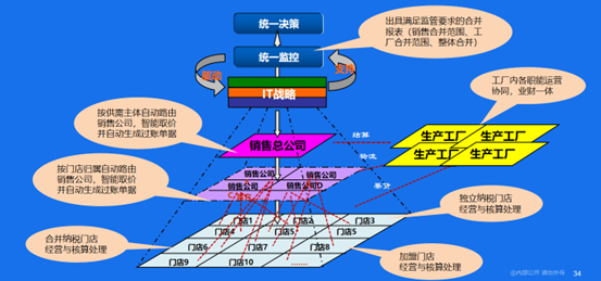各業務板塊搭建統一信息化平臺,分銷供應一體化、工廠運營協同化、財務管控精細化。三條管控主線貫通并彼此呼應,滿足了終端、分銷、工廠端到端的人業協同需求,有效支撐起復雜體系下的業財一體化。